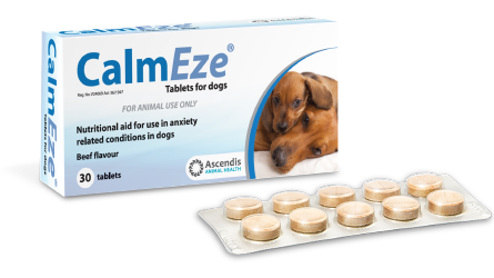 Indications: Nutritional aid for use in anxiety related conditions in dogs. Calmeze tablets are intended for use in highly strung or anxious dogs. The product is a beef flavoured tablet containing vitamins and amino acids that promote relaxation. It can be used in stressful situations as well as relieve of anxiety as a result of weaning, seperation, transport to a new environment, kenneling, hospitilasation and fear of travel.