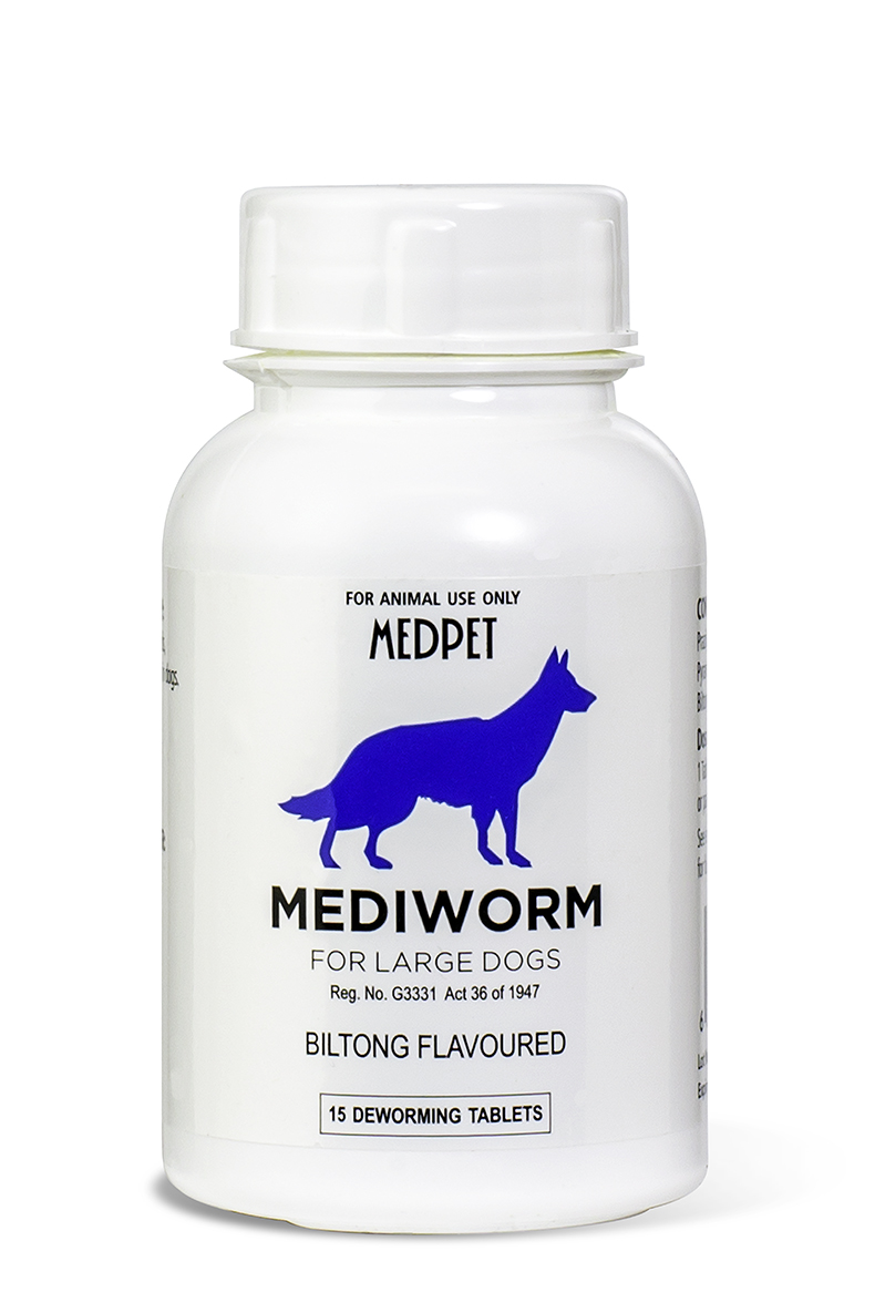 A broad spectrum dewormer for the treatment of Hookworm, Roundworm and Tapeworm in large dogs. Higly palatable biltong flavoured tablets. Does not cause nausea or vomiting. One tablet per 40kg bodyweight. Extremely cost effective. Higly effective. Ingredients: Praziquantel (300mg). Pyrantel pamoate (800mg). Biltong flavouring.