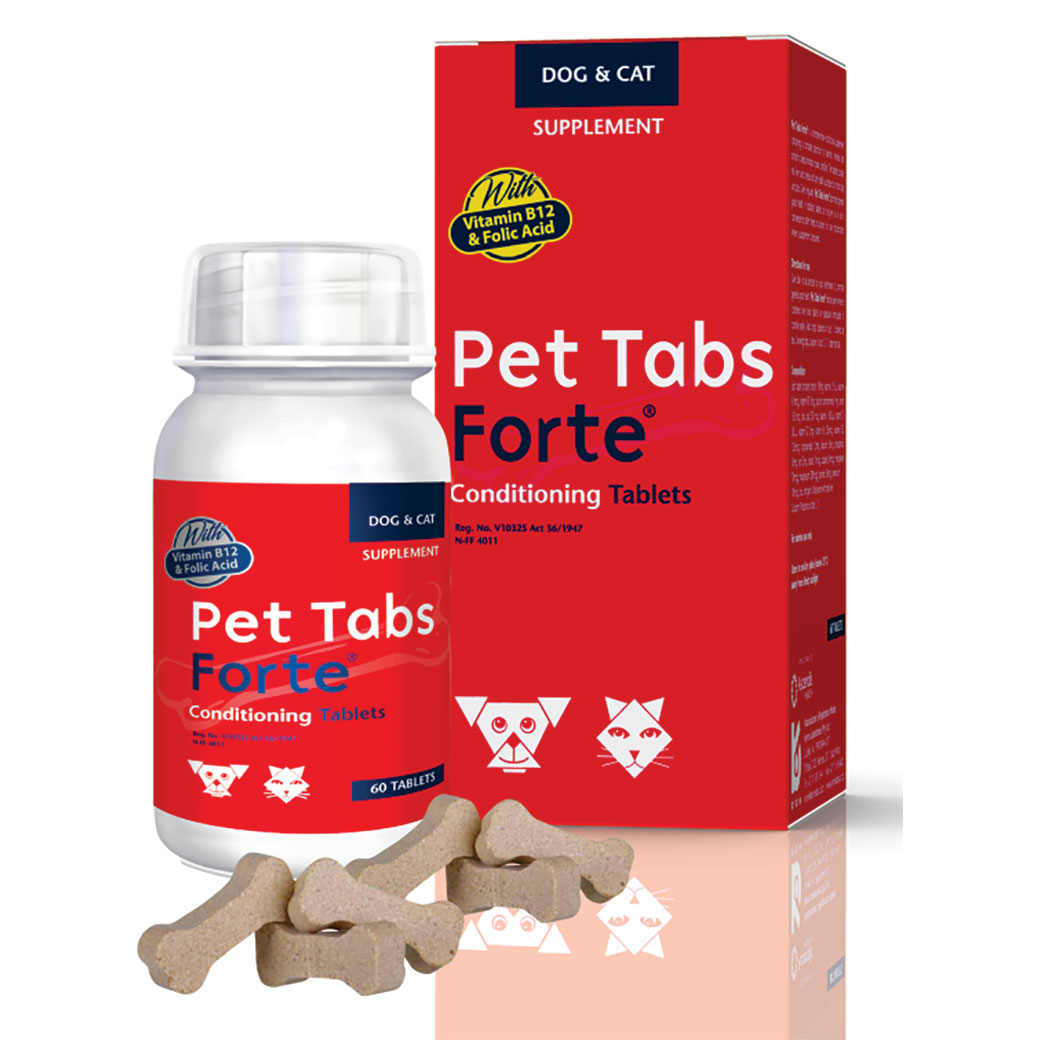 Pet Tabs Forte® Advanced is a comprehensive nutritional supplement containing a complete spectrum of vitamins, minerals and protein to keep animals in peak condition. Now fortified with Vitamin B12 and Folic Acid, the bone shaped tablets contain real liver and cheese and are readily accepted by most dogs and cats. Given regularly, Pet Tabs Forte® Advanced promotes general good health. In addition, tablets can be given as an aid in convalescence after illness or surgery or in any circumstance where a supplement is required.